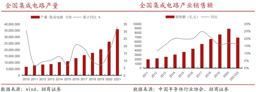 我国集成电路产业持续高速增长。2021年全国生产集成电路3594.3亿块,同比增+33%,根据中国半导体行业协会数据,去年前三季度集成电路产业规模同比+16.1%至6858.6亿元。随着半导体国产替代推进,电子行业预计仍将维持高景气度。