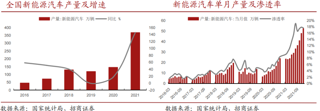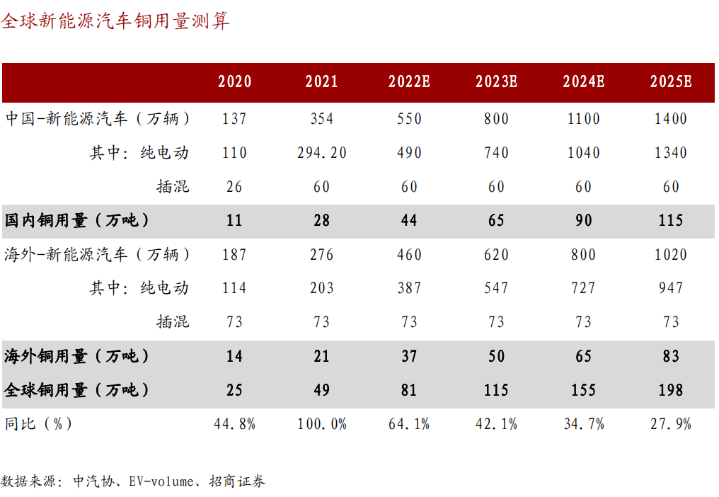 新能源车单月渗透率接近18%。根据中国汽车工业协会数据,2021年全国新能源汽车产量354.5万辆,全年渗透率13.6%,其中12月单月产量为52.2万辆,渗透率高达17.9%。预计2025年全球新能源汽车铜用量将达到198万吨,5年CAGR约52%。