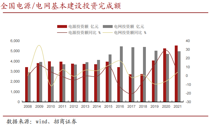 电源投资额增速放缓,电网投资增速由负转正。2021年全年国内电源投资完成额为5530亿元,同比+4.5%;电网累计投资完成额4951亿元,同比+4.1%。电源投资电源投资额连续第二年超过电网投资额。