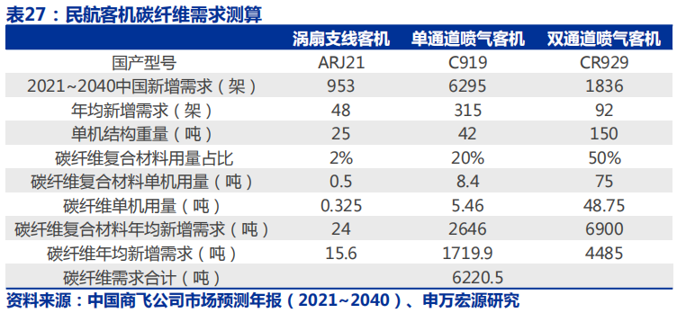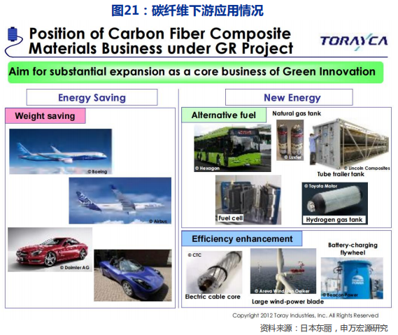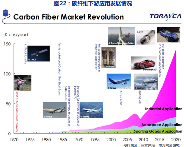 认为随着中国碳纤维生产能力与成本的赶超,叠加上下游产业链配套(主要是复合材料创新工艺与成本下降),碳纤维行业下游需求有望加速扩张。