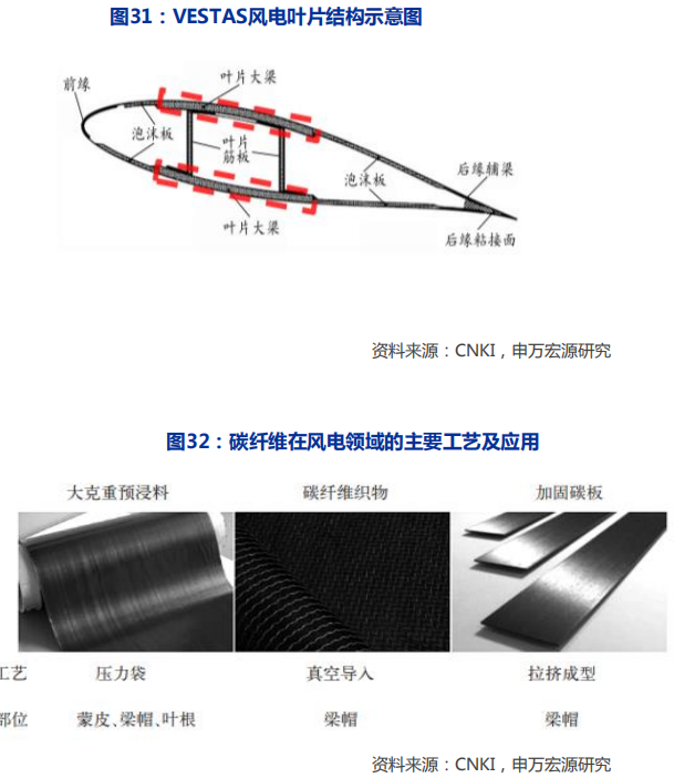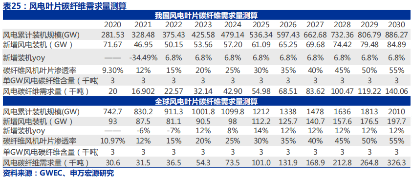 风电用碳纤维的增长逻辑在于:1)碳中和背景下,风电市场的高景气;2)陆上风电转移到海上风电,风机叶片的大功率化和大型化成为必然,玻纤已无法适用于大尺寸风电叶片,碳纤维在性能方面可实现对玻纤的完美替代。