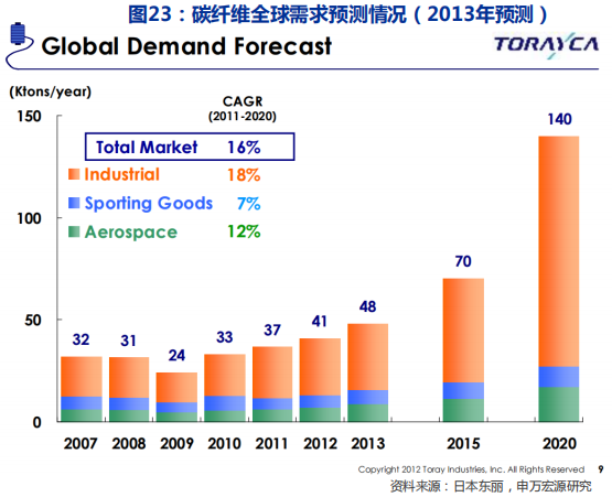 历史上东丽预测2020年碳纤维行业需求达到14万吨,但实际上2020年全球需求约10.69万吨,即使考虑2020年开始的疫情对各领域需求的影响,东丽当年对行业需求的估计仍显乐观。