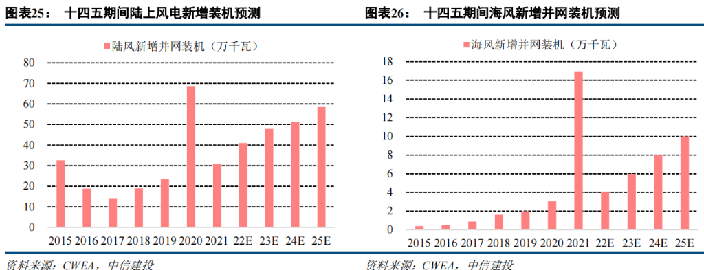 此前《玻纤系列报告二:掘金双碳政策的风电纱》测算,2022 年之后中国风电新增装机将逐年持续增长,到 2024-2025 年陆风有望突破每年 50GW 的新增并网装机,海风整个十四五期间年均新增并网装机有望超过 8GW。
