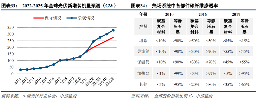 预计 2022-2025 年全球光伏新增装机量逐年稳步提升,带动碳/碳热场材料快速发展。2021 年国内外光伏市