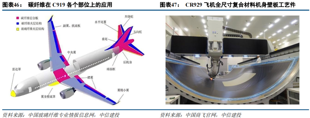 我国在 2017 年首飞的中国商飞 C919 大客机采用了碳纤维复合材料,大概占整机重量的 11.5%,其应用范