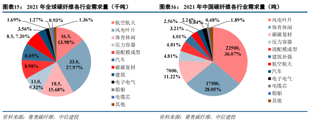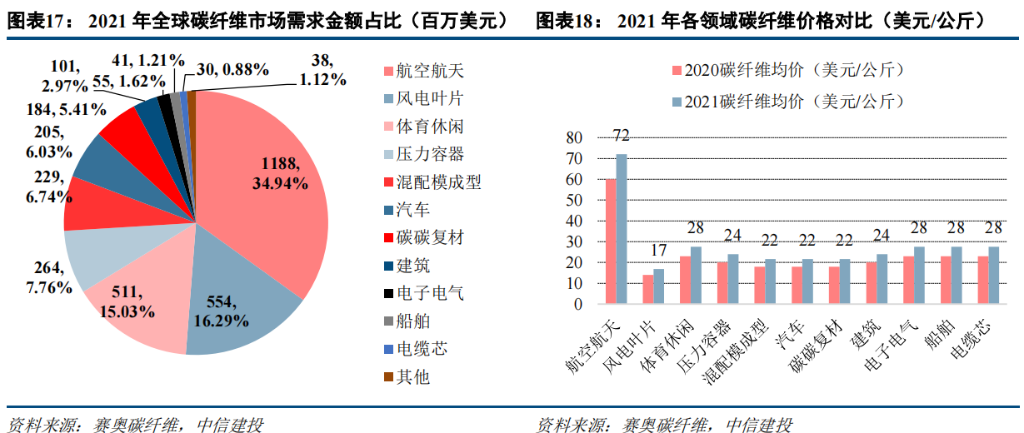2021 年全球航空航天碳纤维需求金额 11.88 亿美元,占比高达 34.94%。风电叶片作为近年来发展起来的碳纤维