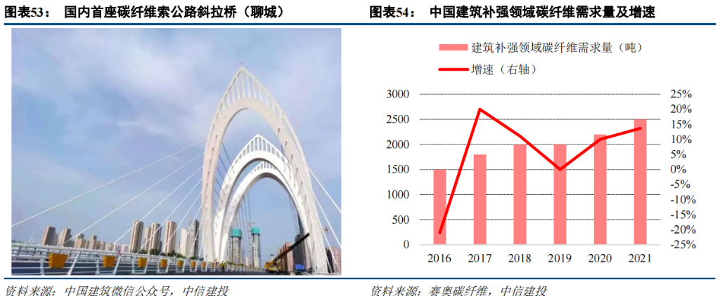 桥梁、隧道及工业管道等领域,其中有 80-90%的碳纤维用于建筑及桥梁结构加固补强。2021 年 12 月,国内首