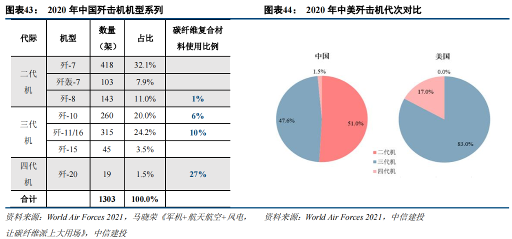 天用于机翼、口盖、前机身、中机身、整流罩等多个部位。根据马晓荣《军机+航天航空+风电,让碳纤维派上大用场》数据显示,以美国军机为例,F-14A 战机碳纤维复合材料用量仅有 1%,到 F-22 和 F-35 为代表的第四代战斗机上碳纤维复合材料用量达分别为 24%和 36%,大型轰炸机方面 B-2 隐身战略轰炸机的碳纤维复合材料占比达到了 38%。目前我国最先进的第四代战斗机歼-20 的碳纤维使用比例为 27%,相比之下第三代战斗机歼-10和歼-11 的碳纤维用量仅为 6%和 10%。据马晓荣论文数据预测,