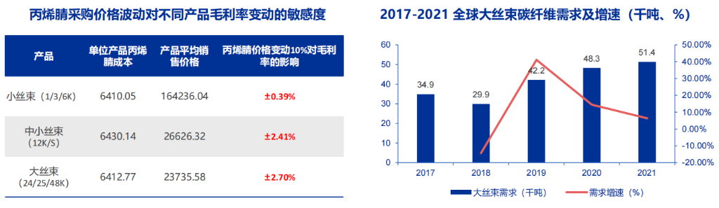 2021年丙烯腈价格进入上行周期,面对成本上涨原丝、碳化环节企业提高售价,同时产品供不应求,单吨盈利增大,企业利润增加,因而获得超额收益。