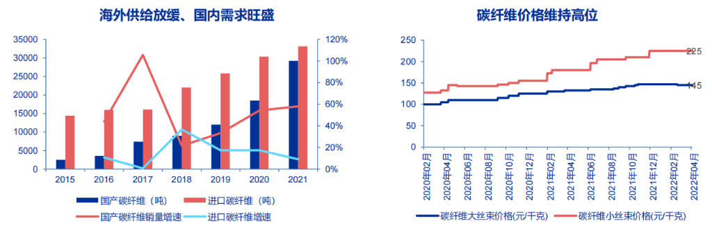 2020年初至今碳纤维涨幅显著,截止22年4月,小、大丝束国内均价225元/KG、145元/KG,两年CAGR分别为33%、20%,由于下游需求旺盛,22年初丙烯腈价格回落至1.1万/吨并未带来碳纤维售价回落。