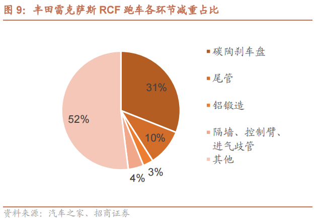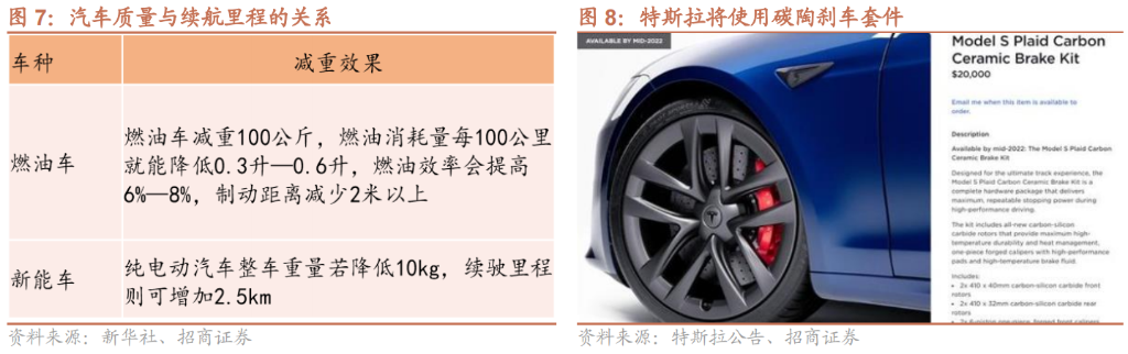 电动化及轻量化趋势下,碳陶盘能够达到减重效果,降低里程焦虑。新能源车与燃油车相比,虽然没有了发动机和变速箱,但是增加了电池组,重量相对于燃油车更重,因此新能源车减重任重道远,碳陶刹车能有效降低悬挂系统以下重量,能更好的地适配新能源车,降低里程焦虑。