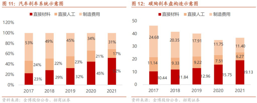 产品直接材料成本占比较低,存在较大技术、规模降本空间。以金博股份为例(公司全部产品系碳碳复合材料,成本结构代表性较强)。2021年公司热场系列产品单吨成本为37万元/吨,较2017年的46万元/吨下降了20%,2021年单吨制造费用为11.40万元,较2017年的24.68万元下降了53.8%,技术降本显著,2021年原材料成本占比为52%,随着规模扩大、技术升级、自动化水平提升和碳纤维价格下降,产品的降本空间巨大。当前碳陶刹车片单片价格约2500-3500元,对用C级及以上乘用车市场,非凡娱乐 预计2025年单片价值有望下降到1000-1200元左右,将下探到B级及以上乘用车市场。