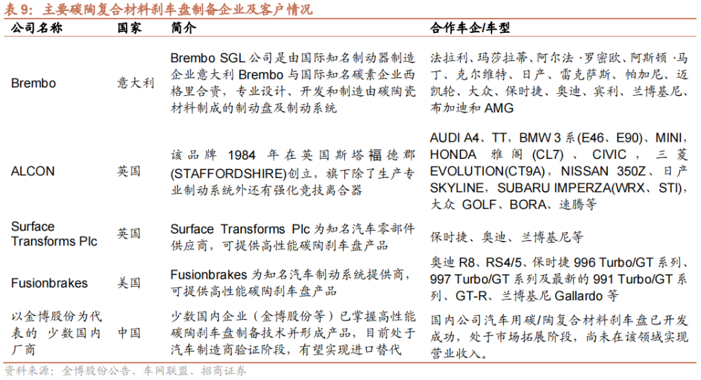 碳碳复合材料由于成本高,目前主要用于飞机制动器,随着近年来高速铁路的发展,国内外科技工作者开始研制开发用于高速铁路的碳陶复合材料摩擦副,碳陶复合材料是一种国际上重点开发的摩擦副材料,我国也已经处于起步阶段,碳陶刹车盘未来降本空间较大,有望成为刹车产品的主要发展方向。