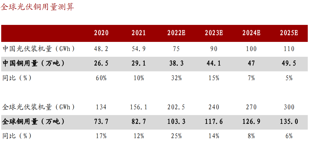 光伏电池板中铜可用于制造高、低压电缆和光伏集热器的铜管。根据Navigantresearch数据,单位GW光伏装机铜用量约0.55万吨。