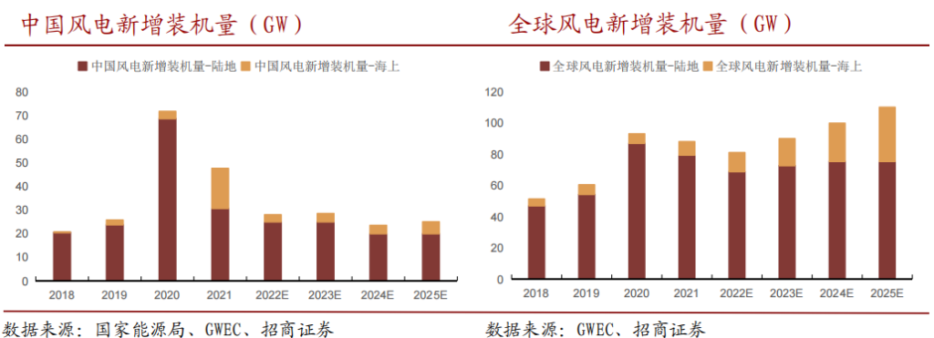 受国内补贴政策影响,国内过去两年分别出现陆上风电和海上风电的抢装潮,2020年陆地风电新增装机量达68.61GW,2021年海上风电新增装机量达16.9GW,今年预计将回归常态。受此影响,全球风电新增装机量今年预计将连续第二年小幅走低,但未来仍有较大增长空间,根据全球风能理事会(GWEC)的预测,2025年全球风电新增装机容量将突破110GW,海上风电将高达31.5%。