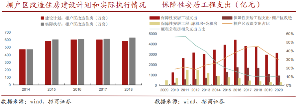 2014 年-2018 年;棚改货币化启动,棚户区改造进入全面快速发展阶段2014 年 7 月,国务院发布《国务院办公厅关于进一步加强棚户区改造工作的通知》,要求各地区抓紧编制完善 2015-2017 年棚户区改造规划, 标志着棚改进入全面快速发展阶段。 在 2015 年国务院颁布《关于进一步做好城镇棚户区和城乡危房改造及配套基础设施建设有关工作的意见》。从棚户区实际建成情况来看, 2014-2018 年共改造棚户区 2912 万套, 2015 年后全国棚改开工量持续维持在 600 万套以上,超额完成规划建设任务。从公共财政支出来看,2014 年-2018年,租赁型住房占比出现明显回落,棚改相关支出提升至 2018 年的 45.11%,在此阶段国家保障性安居工程主要以棚户区改造为主。