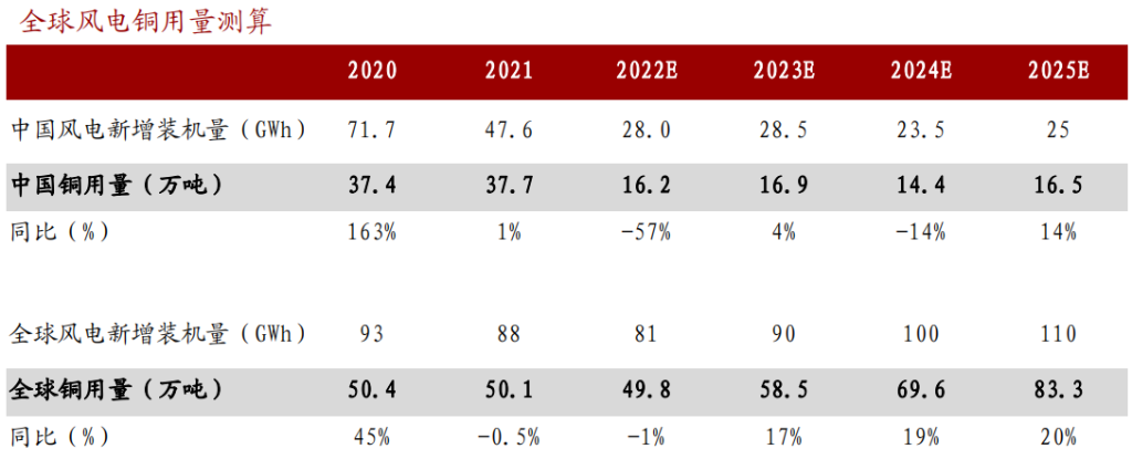 铜主要用于风力发电机的定子和转子部分的线圈绕组、高压电力电缆导体和变压器线圈。风电领域分为陆上风电和海上风电,海上直驱风电机组铜用量约16kt/GWh,双馈电机铜用量约11kt/GWh;陆上直驱风电机组铜用量约7kt/GWh,双馈电机铜用量约2.7kt/GWh。