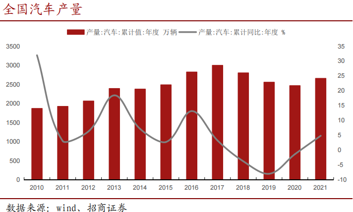 2021年我国汽车产量结束了2018年以来连续三年下降的局面。2021年全年我国汽车产量2608万辆,同比+3.4%。前期因供应链问题导致的全球芯片短缺令汽车产销承压,预计随着供应链逐渐恢复,汽车产量今年有望继续走高。