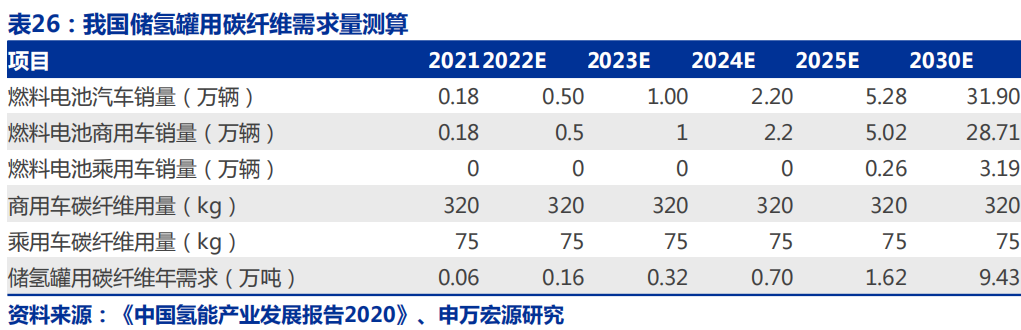 碳纤维是储氢罐最为主要的材料,据美国DOE数据,储氢罐成本占比超过50%,乘用车储氢罐单车用量为75kg,商用车储氢罐单车用量为320kg,结 合《中 国 氢 能 产 业 发 展 报 告2020》,2025/2030氢 燃 料电 池 汽 车10/100万辆的规划,非凡娱乐