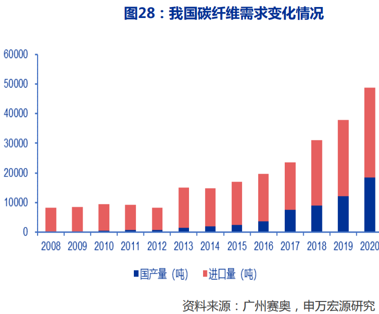 认为随着中国碳纤维生产能力与成本的赶超,叠加上下游产业链配套(主要是复合材料创新工艺与成本下降),碳纤维行业下游需求有望加速扩张。