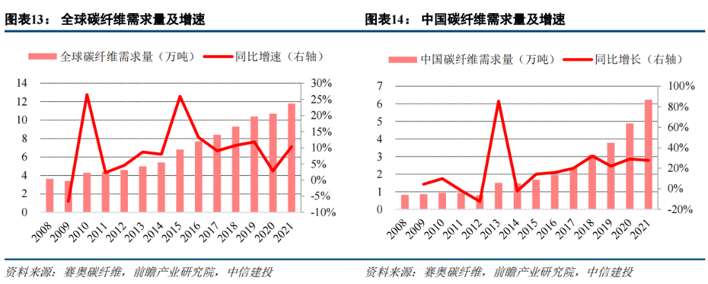 需求量 CAGR 达 10.37%;2021 年全球碳纤维需求量同比增长 10.38%至 11.80 万吨,增速显著提升 7.59 个百分点。