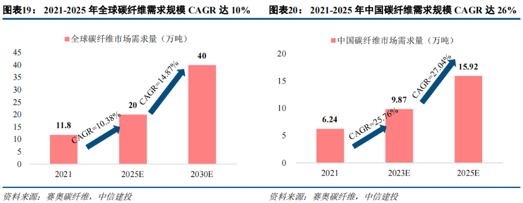 求量有望从 2021 年的 11.8 万吨提升至 2025 年的 20 万吨,4 年复合增速 10.38%;中国碳纤维需求量相应从 2021年的 6.24 万吨提升至 2025 年的 15.92 万吨,复合增速 26.4%。随着国内碳纤维下游应用快速发展,需求量相较于全球获得显著的超额增速。