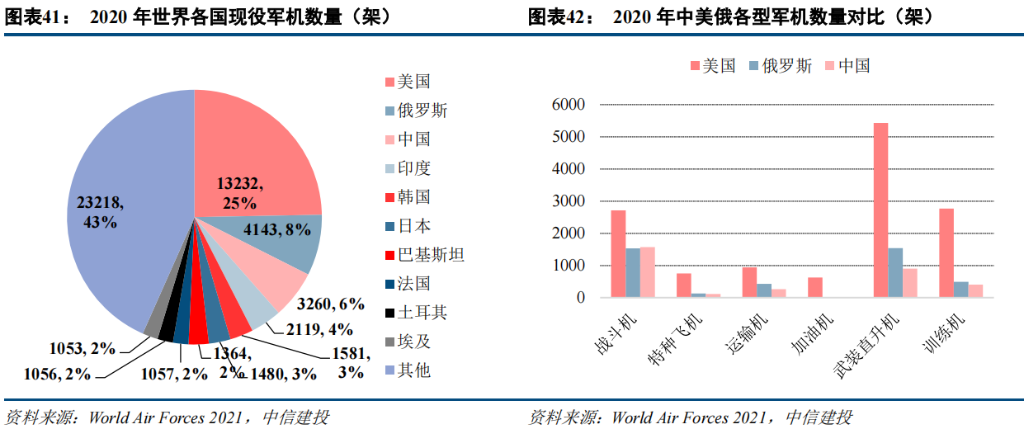 方面,2020 年我国军机数量为 3260 架,占世界军机总量的 6%,占美国军机总量的 25%,数量差距较大。其中我国战斗机总量 1571 架,虽排名第三但远低于美国的 2717 架。受益于“十四五”强军强国政策的大力推进实施,实现“把人民军队全面建成世界一流军队”的目标,我国军机增补空间很大。
