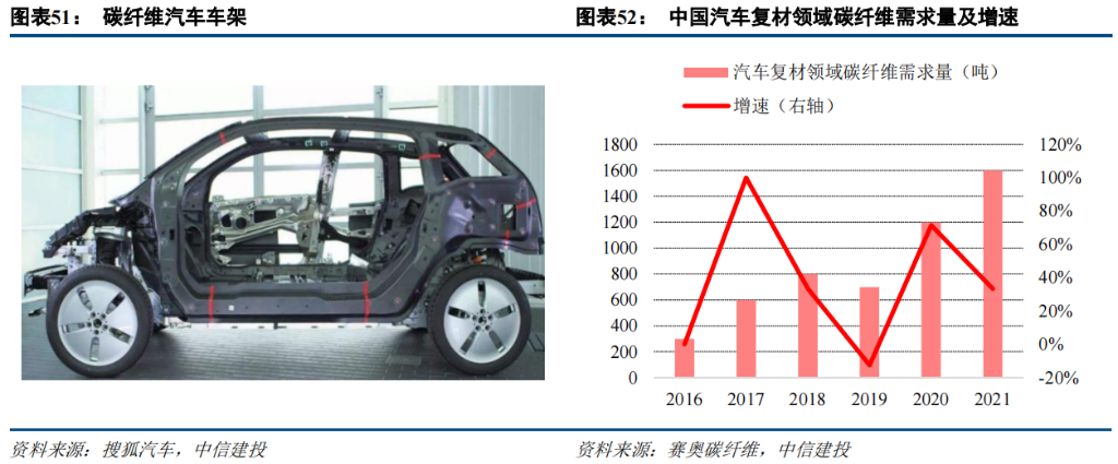 品中加入碳纤维复合材料,如雪佛兰 C8 汽车车架部分材料使用的就是弧形拉挤的碳纤维复合材料型材。奔驰企业也和日本东丽联手开发车用碳纤维的运用,推动碳纤维在车辆产业的普及化。2021 年中国汽车领域碳纤维需求量 1600 吨,同比增长 33.3%,过去 5 年 CAGR 达 39.77%。