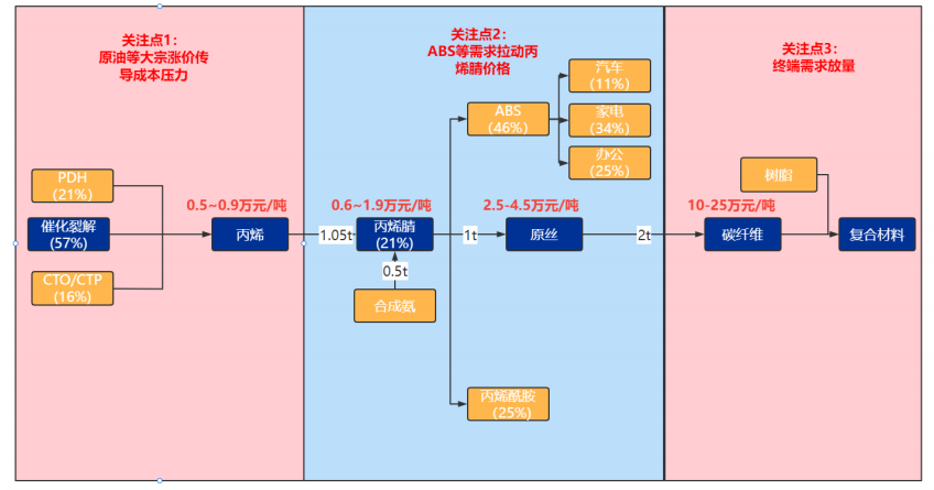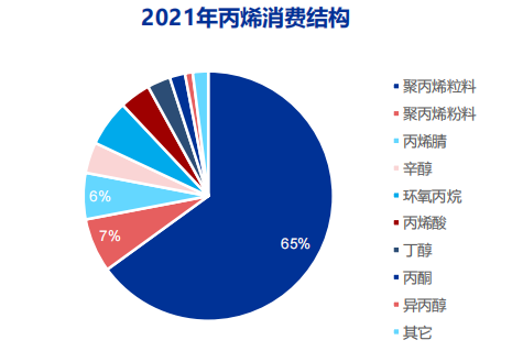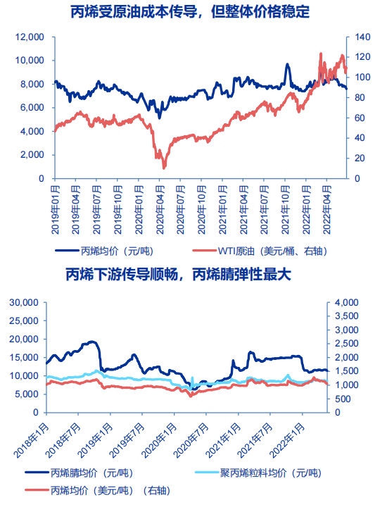下游需求主要为聚丙烯粒料、聚丙烯粉料、丙烯晴及环氧丙烷,其中聚丙烯粒料占比最大,为65%。从历史价格复盘表现来看,下游聚丙烯、丙烯腈都有较强的转价能力,其中丙烯腈的弹性最大。