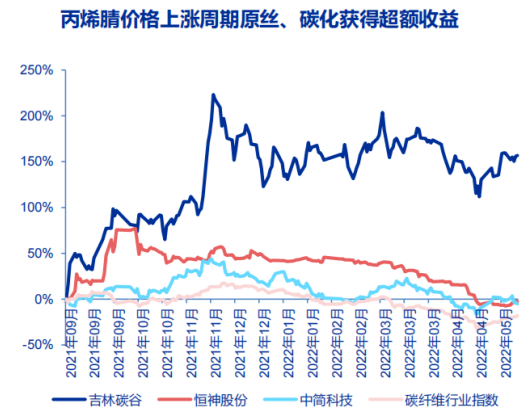 2021年丙烯腈价格进入上行周期,面对成本上涨原丝、碳化环节企业提高售价,同时产品供不应求,单吨盈利增大,企业利润增加,因而获得超额收益。
