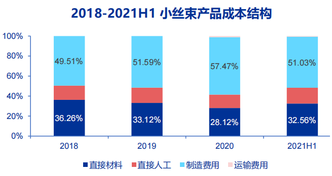 小丝束生产成本由直接材料、直接人工、制造费用和运输费用构成,相比于大丝束碳纤维,小丝束生产效率低、设备投资规模大,因此生产过程中能源消耗大、产线折旧费用高,成本构成中制造费用占比50%以上。