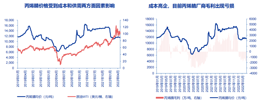 但是目前丙烯腈厂商多出现了1000-2000左右毛利亏损,目前短期成本压力较大;但长期随着原油价格下降,新增产能落地,丙烯腈价格有望进一步下降。