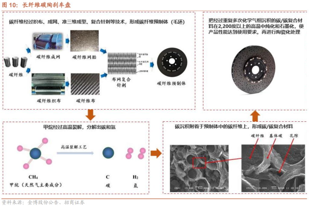 长纤盘的制备首先是将连续碳纤维用针刺法做成碳纤维预制件,然后用化学气相渗透法增碳做成碳碳多孔体,再通过熔融渗硅进行陶瓷化做成碳陶复合材料,最后经机加工成碳陶制动盘。特点是所制备出来的碳陶制动盘综合性能很好,缺点是制备周期比较长,整个工艺下来长达2个月,成本较高。