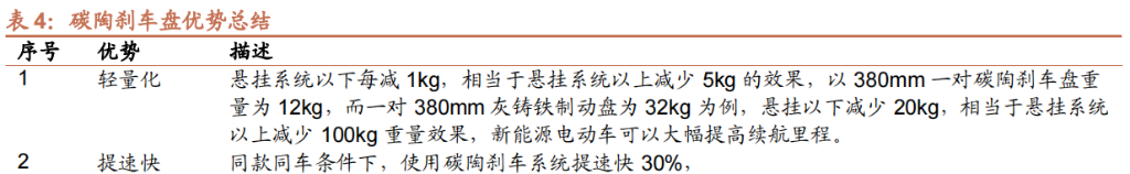 电动化及轻量化趋势下,碳陶盘能够达到减重效果,降低里程焦虑。新能源车与燃油车相比,虽然没有了发动机和变速箱,但是增加了电池组,重量相对于燃油车更重,因此新能源车减重任重道远,碳陶刹车能有效降低悬挂系统以下重量,能更好的地适配新能源车,降低里程焦虑。