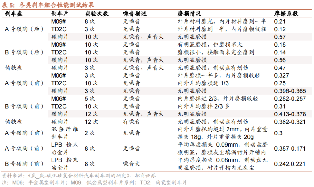 山东大学一研究团队通过实验来筛选最优的刹车盘和刹车片组合,通过实验发现碳陶盘和碳陶刹车片、粉末冶金刹车片配副均显示出较好的效果,其中,碳陶制动盘与碳陶刹车片组成的制动对偶,摩擦系数较高,摩擦磨损情况较其它组合好,碳陶材料作为汽车刹车副具有广阔的发展前景。